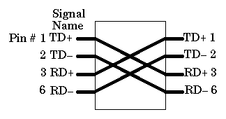 10-Base-T Crossover CableThe following figure shows the correct wiring for a 10Base-T crossover cable (assuming you're using RJ-45 connectors). This cable can be used to connect two computers together without a hub, or to connect two hubs together (without using an uplink port). If you're connecting two hubs together and one of them has an uplink port, use a straight cable (rather than the crossover) to connect the uplink port of one hub to one of the (non-uplink) ports of the other hub. A bit of technical background: Most computer and workstation network adapter cards have interface ports referred to as MDI ports (RJ-45 pin assignments shown on the left side of the above drawing). "Uplink" ports on hubs have the same pin assignments. Most normal ports on hubs have MDI-X ports, which use pins 1 and 2 for receive, and pins 3 and 6 for transmit. A straight cable (one that connects pin 1 to pin 1, pin 2 to pin 2, etc.) can be used to connect an MDI port (a computer) to and MDI-X port (a normal port on a hub). Obviously, to connect two MDI ports together, it is necessary to connect pin 1 to pin 3, pin 2 to pin 6, and so forth. To see more detail about the RJ-45 connector, click here.